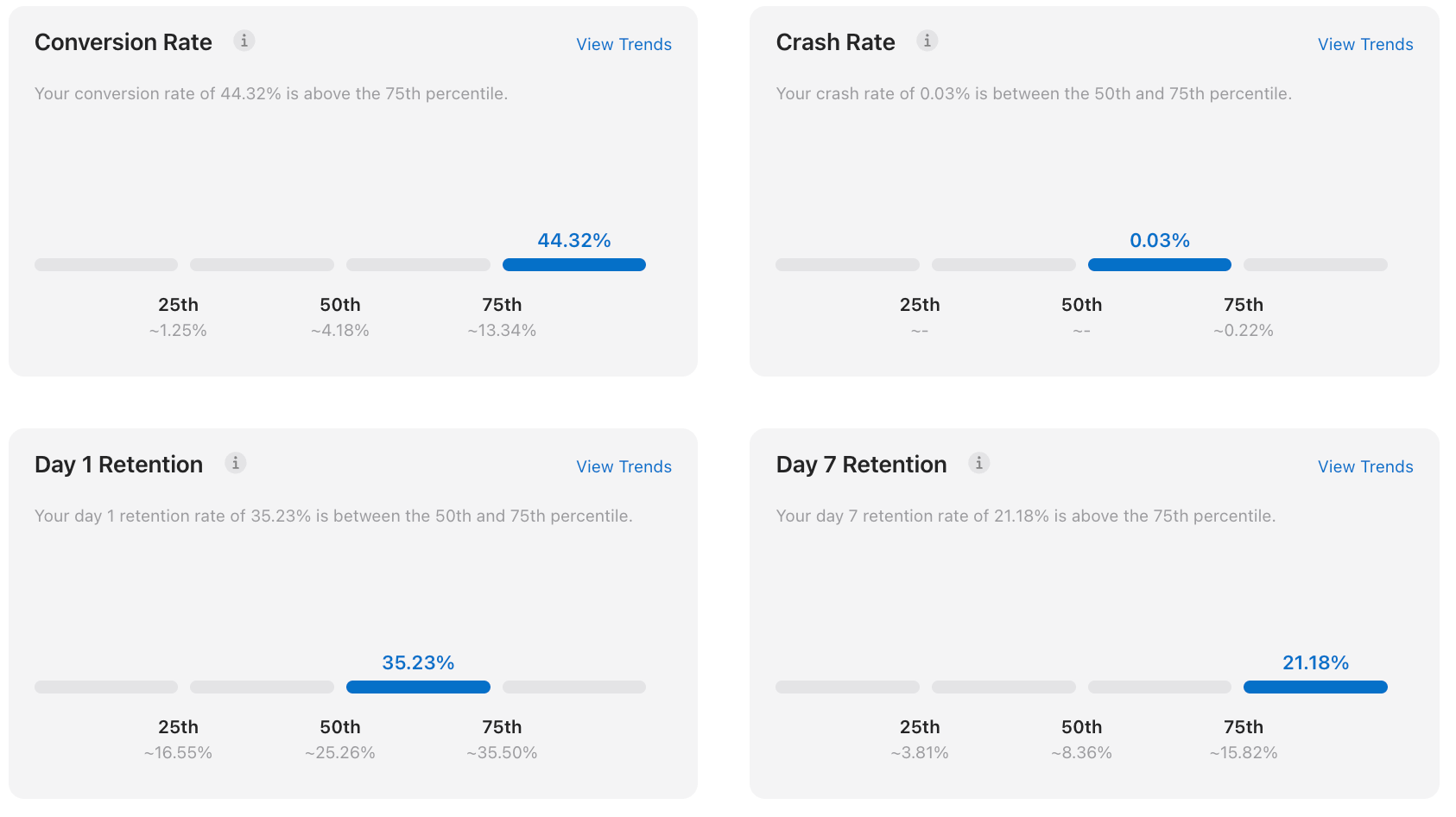 這個 App 有接近一半的轉換率,可以看到所有在 App store 上架的 App 當中,PR 75 的 App 也才只有 13.34% 的轉換率,是我的三分之一。